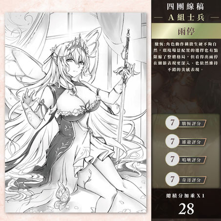 一個美麗的戰鬥女武神,只有著獨眼,所以一邊要設計上眼罩。 服裝是神話風格的優雅套裝,請在肩膀或身上其他一些地方加上裝甲。 性感裸露,但請注意裙子不可過短。 武器是一把兩端巨劍,類似ImageA那樣。